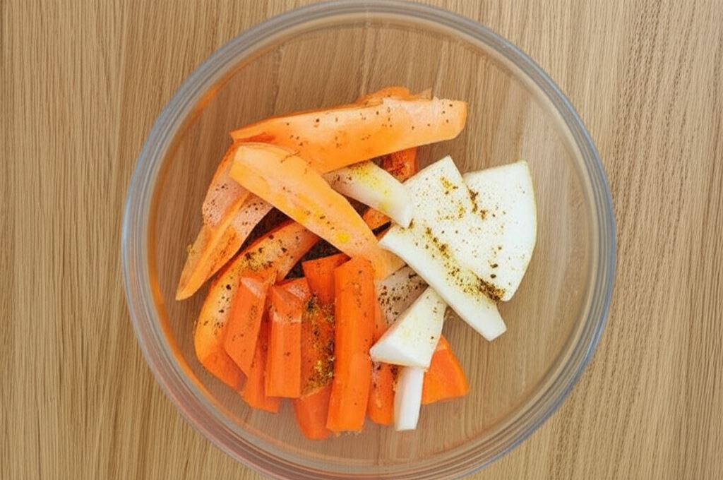 Potnij ziemniaki i warzywa na kawałki zbliżonej wielkości, obłóż w reszcie oleju, przypraw według gustu ulubionymi przyprawami, ułóż na papierze do pieczenia na drugiej blasze.