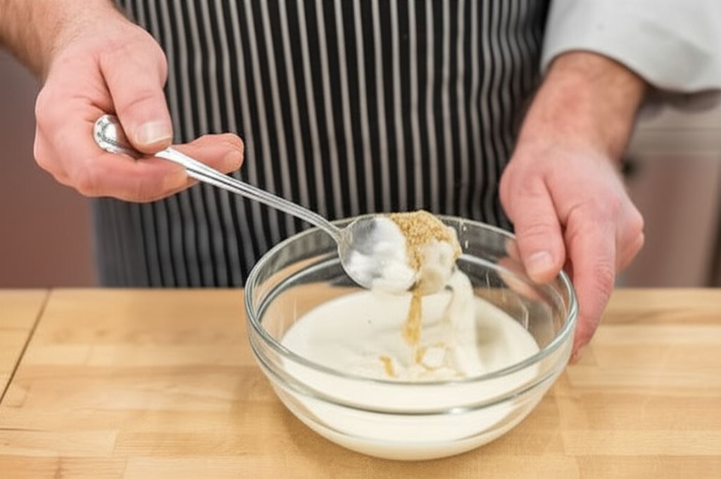 Do pojemnika wsyp zawartość opakowania Naturalnie smaczne Knorr. Proszek starannie wymieszaj z 150 ml wody i śmietaną tak, aby nie zostały żadne grudki.