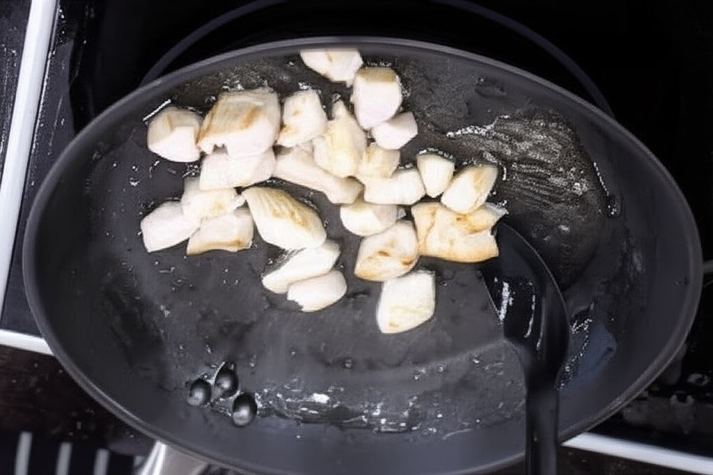 Podsmaż na rozgrzanym tłuszczu piersi kurczaka pokrojone w kostkę. Smaż kurczaka do momentu lekkiego zrumienienia.