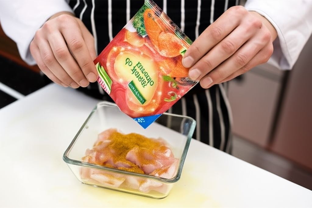 Mięso z kurczaka potnij na wąskie paski i oprósz przyprawą Knorr.