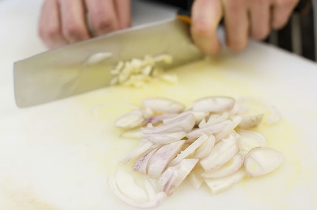 Cebulę potnij w paski, a czosnek drobno posiekaj.