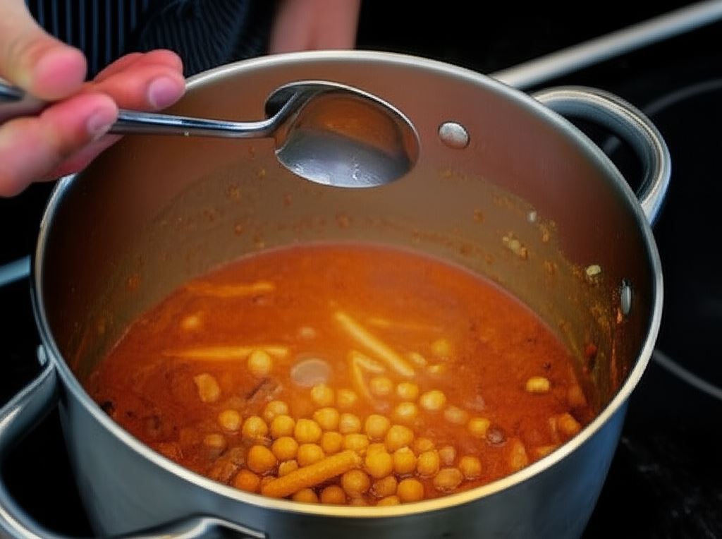 Całość gotuj powoli na małym ogniu przez około 10 minut, następnie dodaj ciecierzycę i gotuj wszystko jeszcze przez 5 minut.