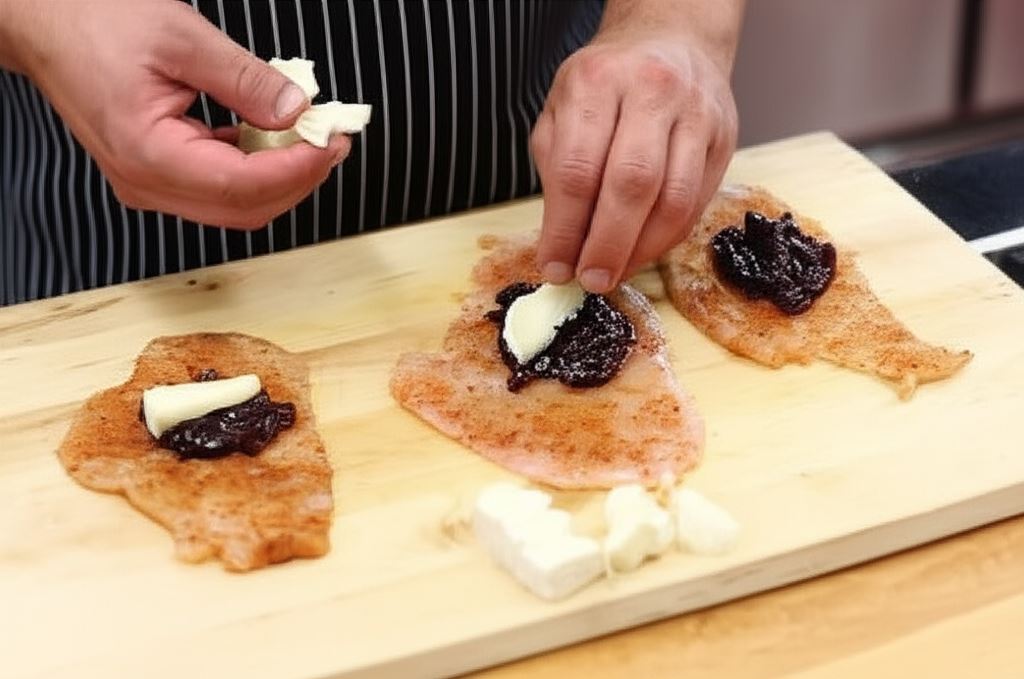 W plasterek marynowanego mięsa owiń łyżeczkę dżemu z cebuli i kawałeczek sera koziego.