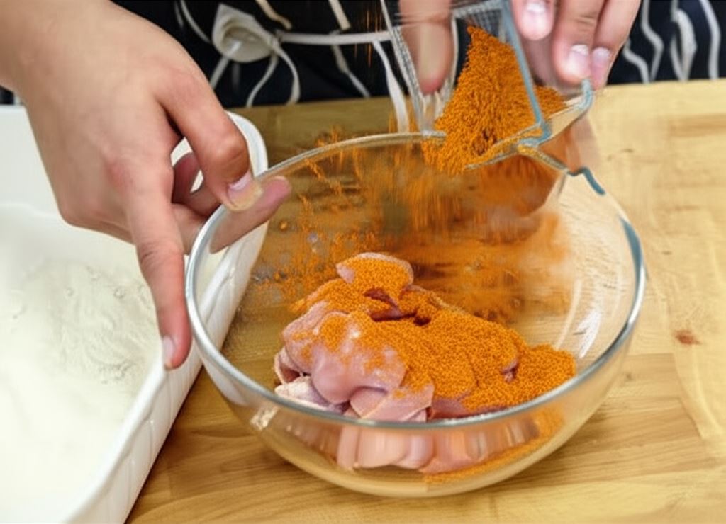 Kurczaka pokrój w kostkę, posyp Przyprawą do mięs Knorr, po czym lekko obtocz w mące.