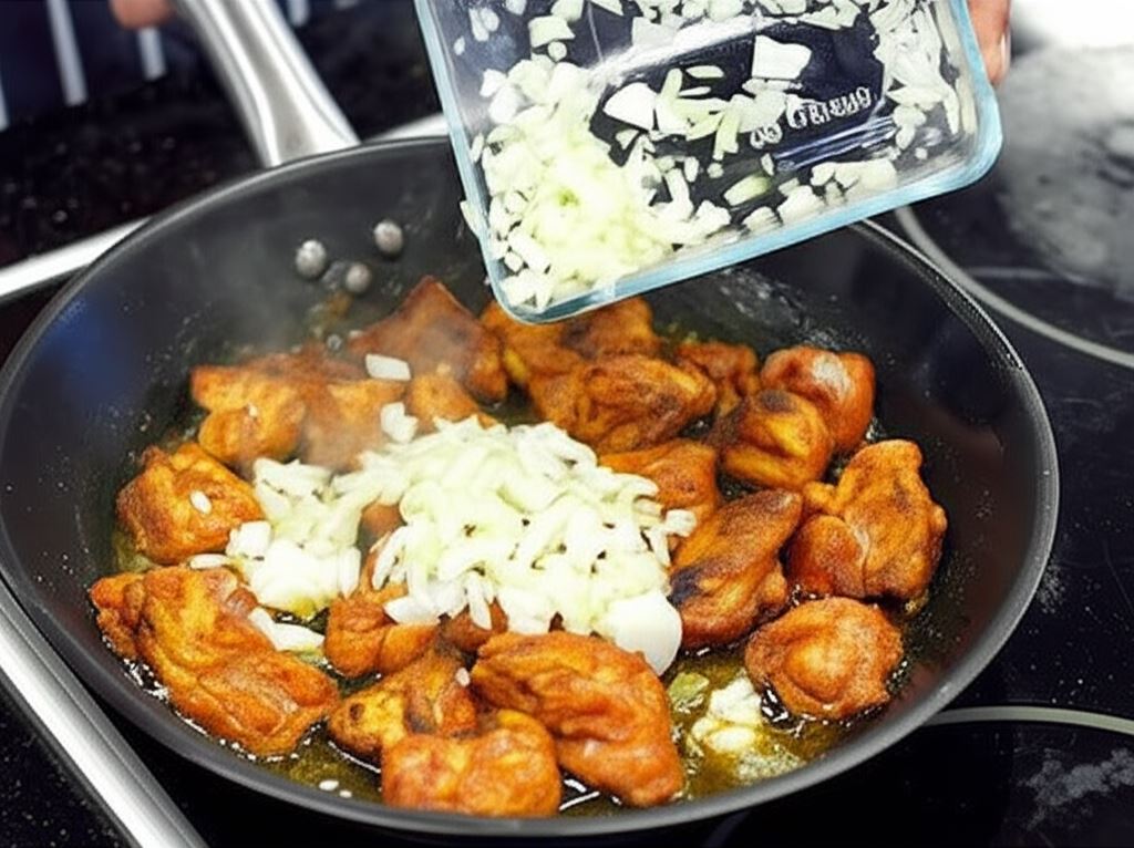 Na rozgrzanej oliwie w garnku lub patelni obsmaż kurczaka z obu stron, po czym wsyp cebulę pokrojoną w kostkę.