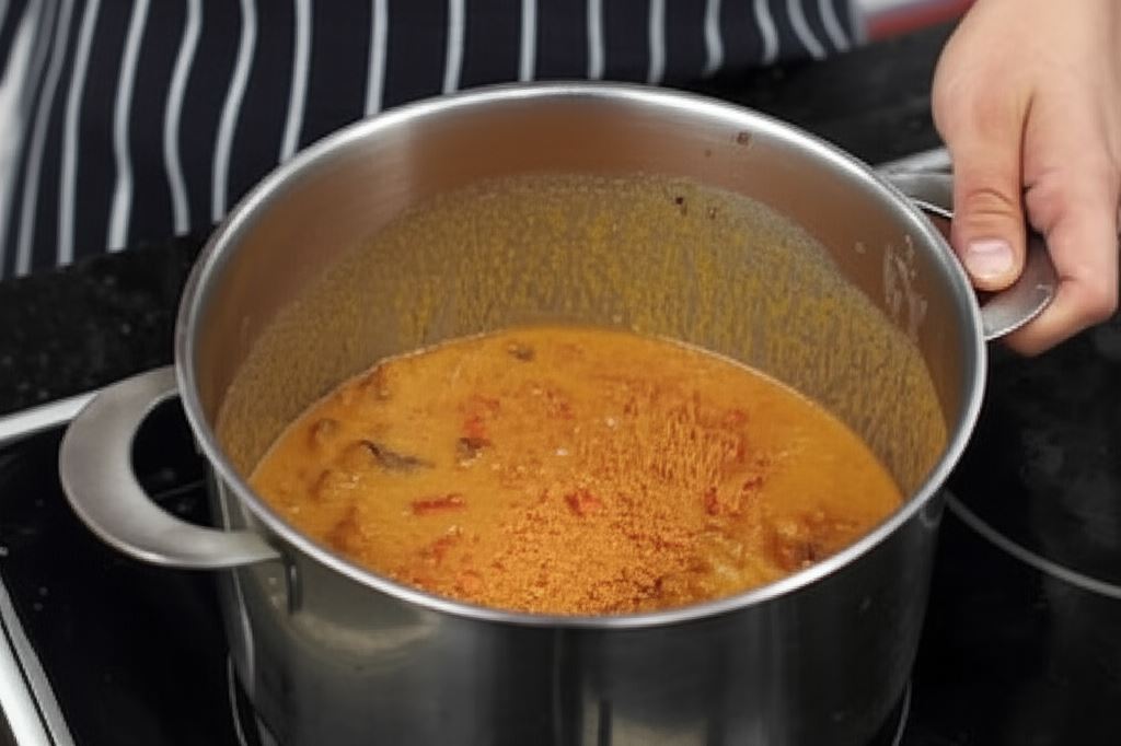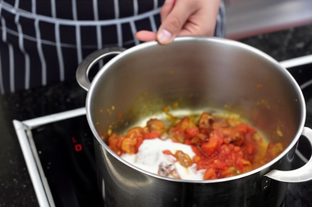 Smaż wszystko, dopóki cebula nie zacznie się brązowić. Następnie dodaj pomidory z puszki oraz napój kokosowy.