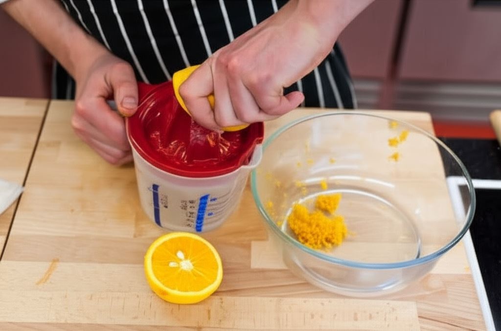 Zetrzyj skórkę z dwóch pomarańczy, po czym wyciśnij z nich sok.