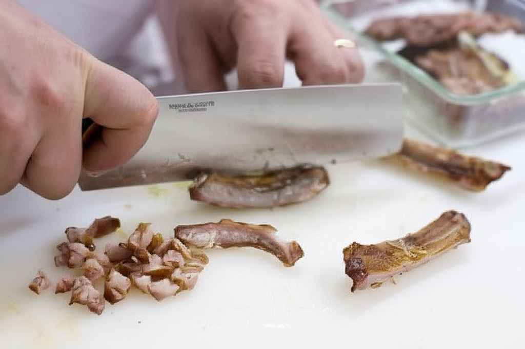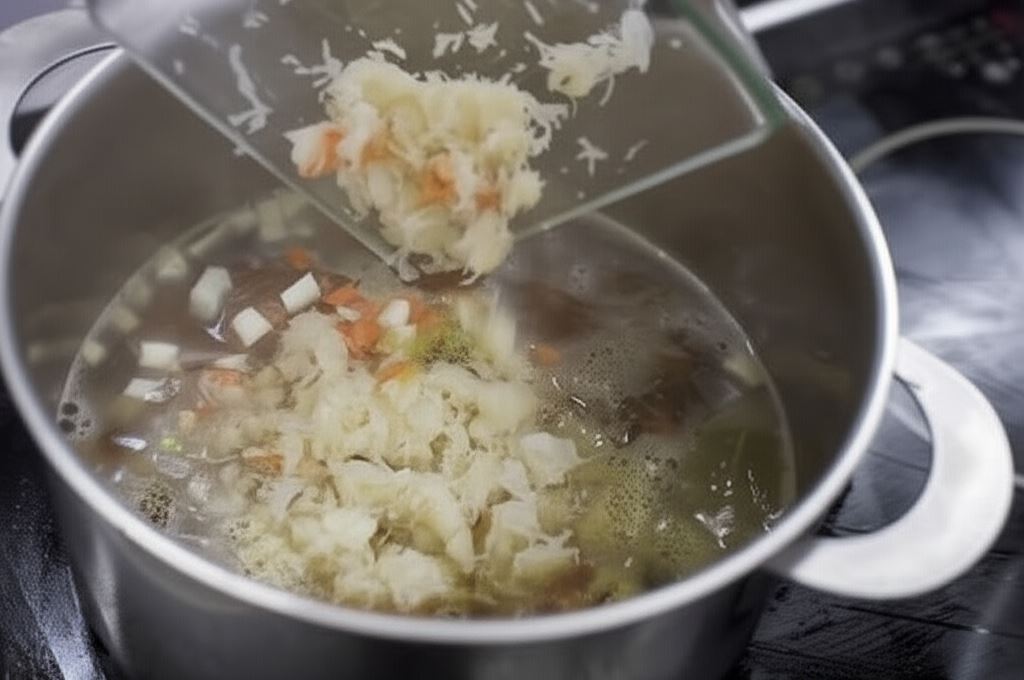 Wyjmij ugotowane żeberka z wywaru i oddziel mięso od kości. Następnie mięso umieść ponownie w garnku.