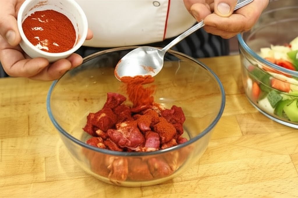 Mięso i warzywa (papryki oraz cebulę) potnij w kostkę 2x2 cm. Mięso posyp papryką i starannie wymieszaj.