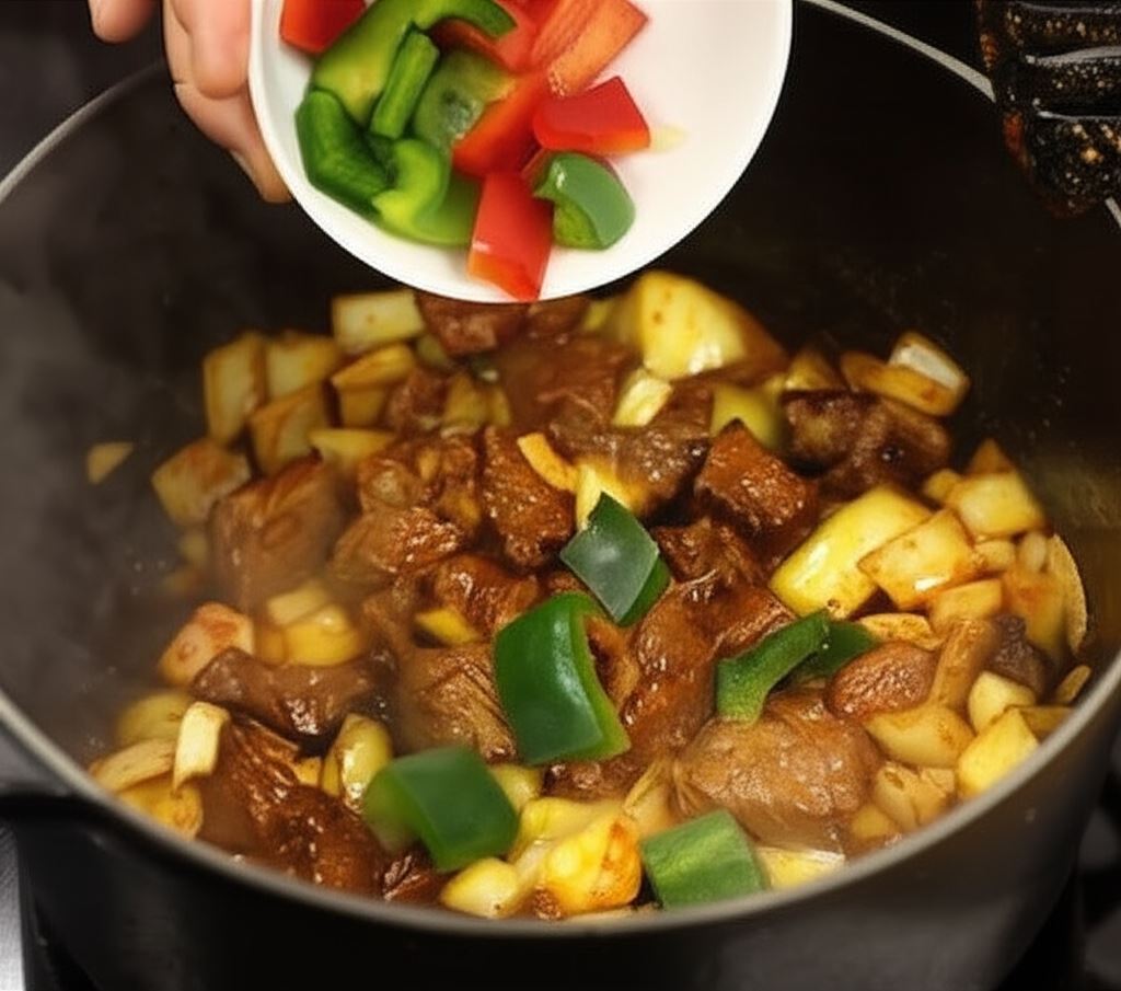 W garnku podgrzej olej, obsmaż mięso, mieszając regularnie, by kawałki zarumieniły się z każdej strony. Po paru minutach wsyp cebulę oraz połowę papryki, smaż 3 minuty.