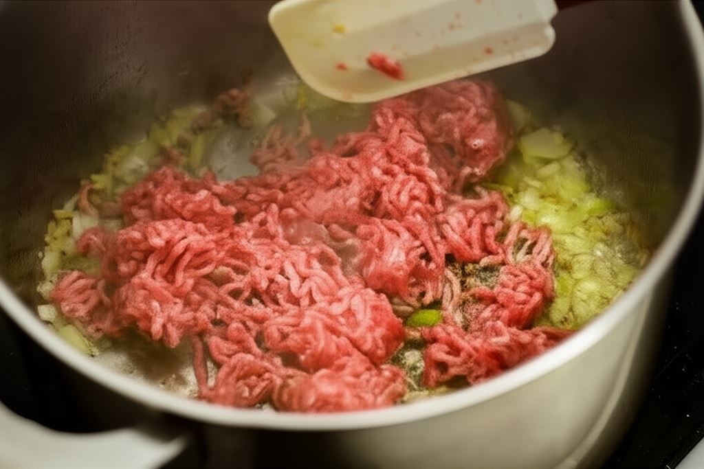 Cebule i czosnek posiekaj na drobną kostkę, wrzuć na nagrzaną oliwę. Gdy się podsmażą dodaj mielone mięso i smaż powoli.