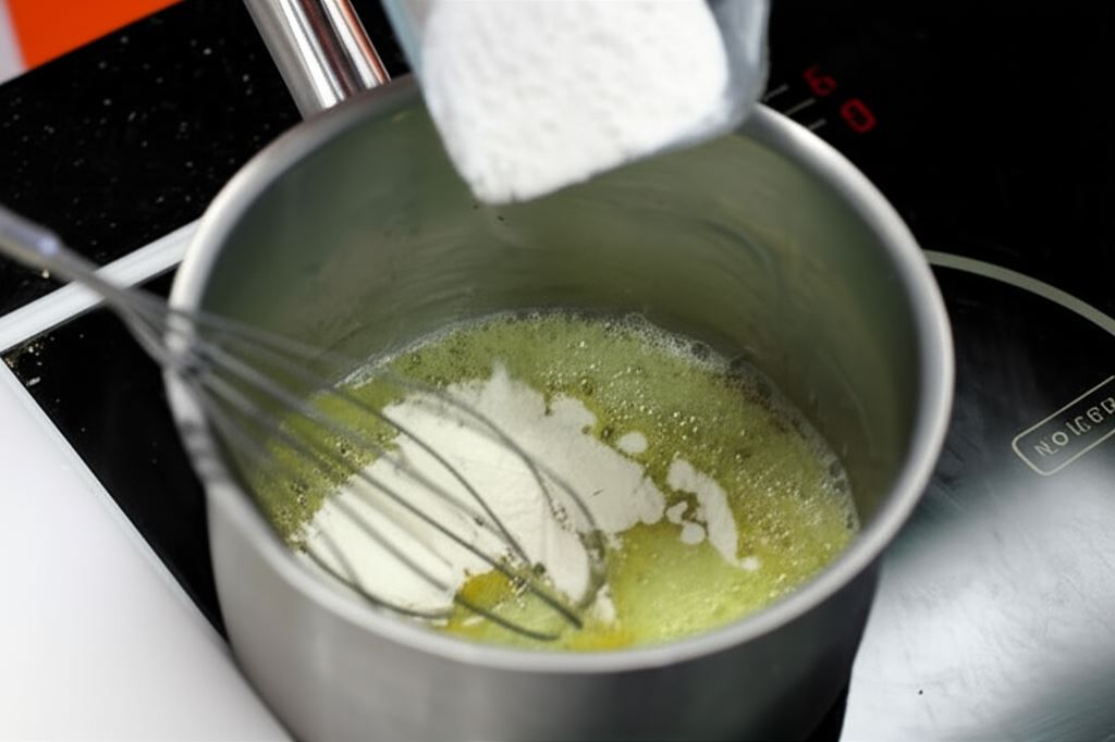 W międzyczasie przygotuj sos beszamel. W rondelku roztop masło i dodaj mąkę. Mieszaj, dopóki mąka nie połączy się z tłuszczem.