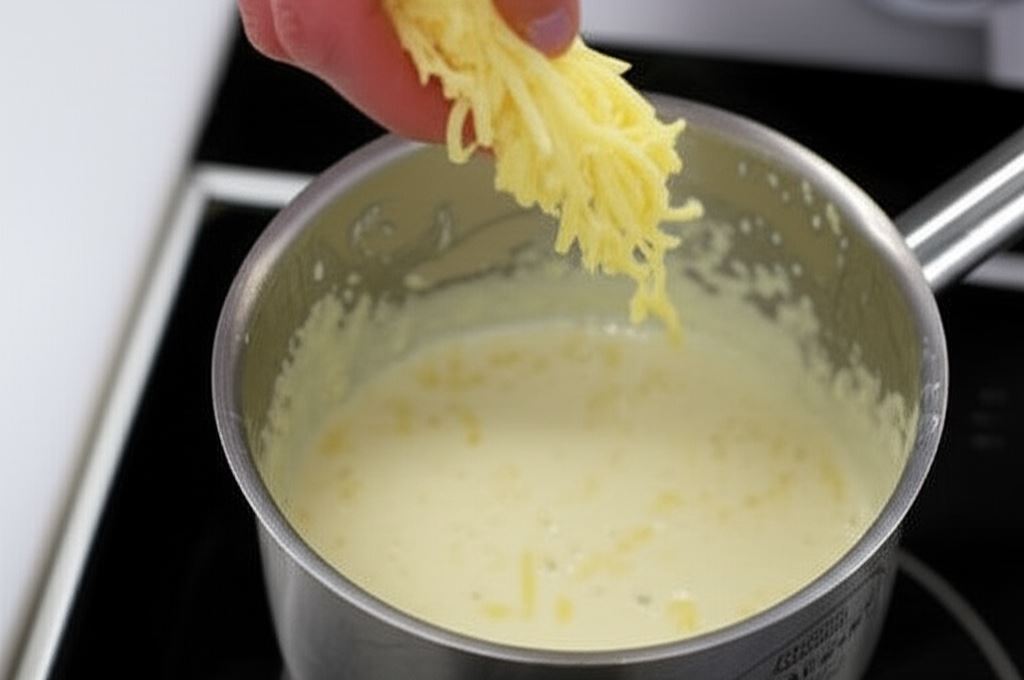 Teraz wlej mleko i energicznie wymieszaj tak, by rozbić wszystkie grudki. Sos doprowadź do wrzenia, przypraw odrobiną soli oraz gałką muszkatołową. Na koniec wsyp do gorącego sosu połowę startego sera (najlepszy będzie o intensywnym smaku). Mieszaj, dopóki ser się nie rozpuści.