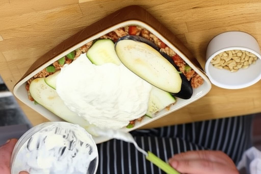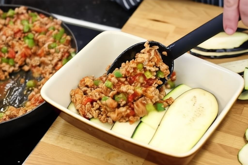 Naczynie żaroodporne posmaruj 1 łyżką oliwy i umieść pierwszą warstwę z plastrów bakłażana i cukinii. Potem wyłóż połowę mięsnego sosu Bolognese i nakryj warstwą cukinii i bakłażana. Operację tę powtórz jeszcze raz.