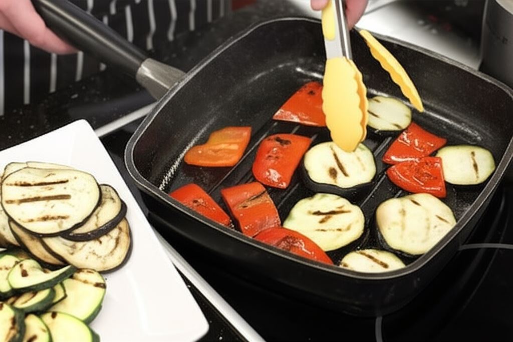 Bakłażana, cukinię i paprykę pokrój w plastry, polej oliwą i przygotuj na domowej patelni grillowej.