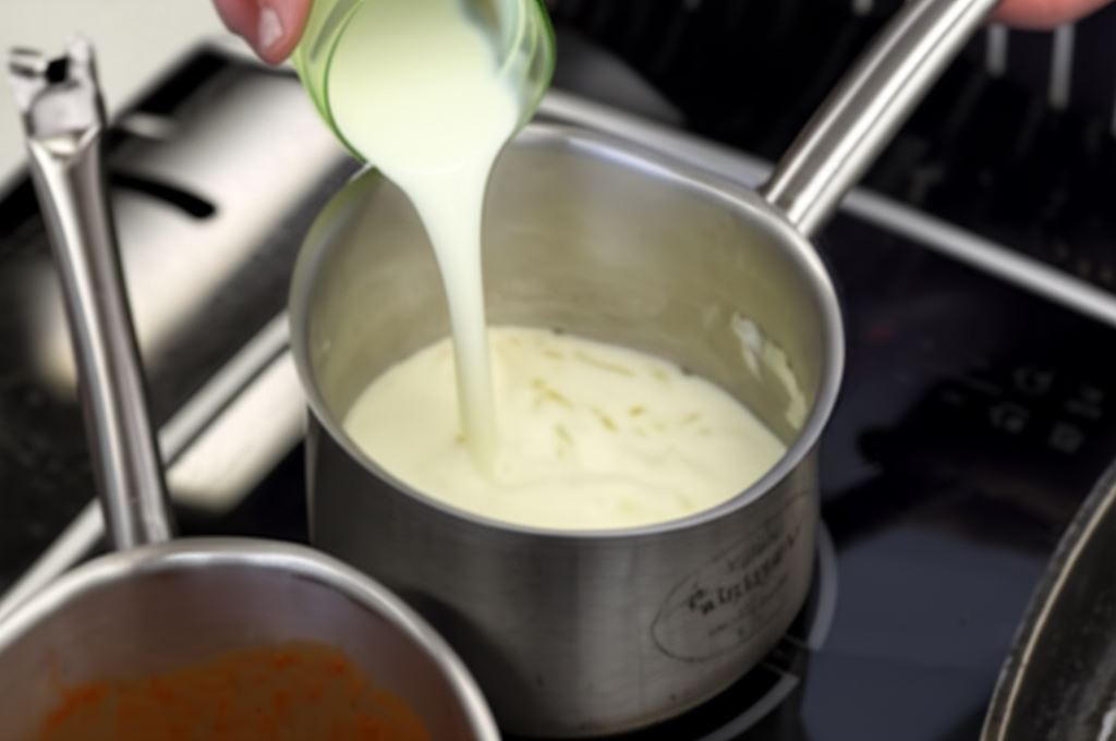 Resztę cebuli podsmaż na oliwie, wlej śmietanę i doprowadź do wrzenia. Sos gotuj przez 3-4 minuty.