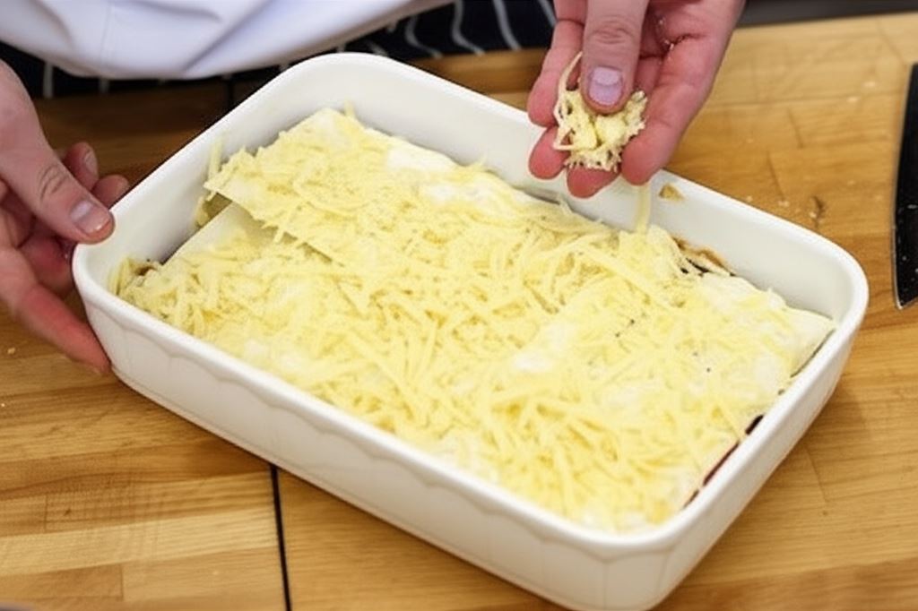 Wierzchnią warstwę pokryj resztą sosu śmietanowego i posyp tartym serem. Naczynie umieść w rozgrzanym do 180 °C piekarniku i zapiekaj przez 25 minut pod przykryciem (np. folią aluminiową).