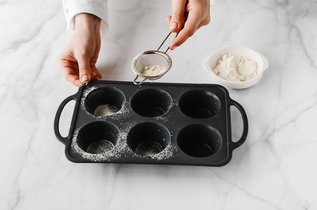 Foremkę muffinkową smarujemy tłuszczem i obsypujemy mąką.