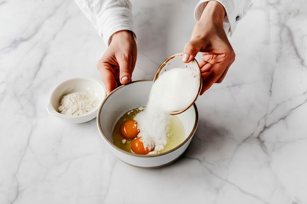 Jajka wbijamy do miseczki. Mieszamy je z cukrem i solą.