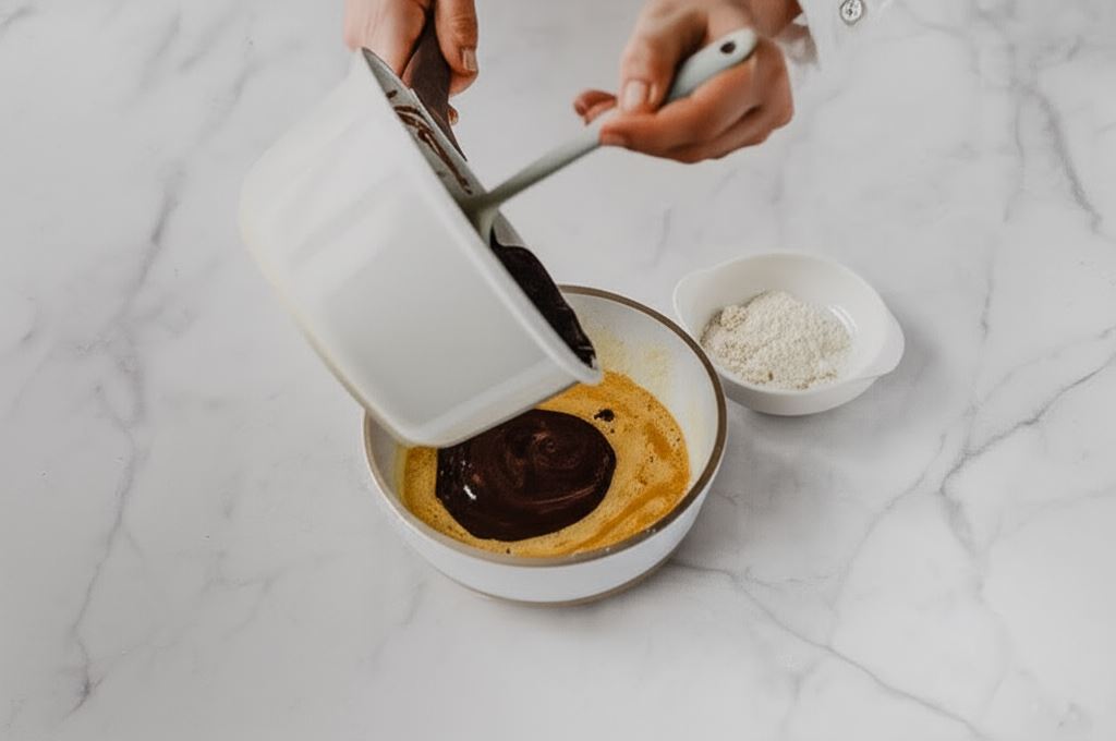 Wlewamy płynną czekoladę i znów mieszamy.