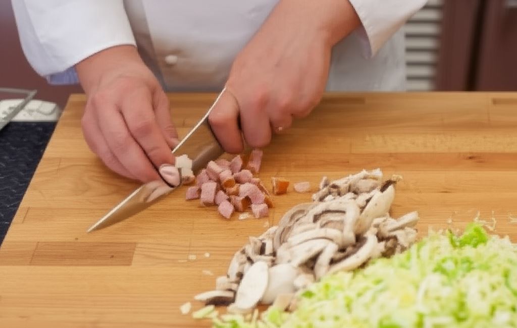 Kapustę drobno poszatkuj, grzyby pokrój w plastry, a kiełbasę w kosteczki.