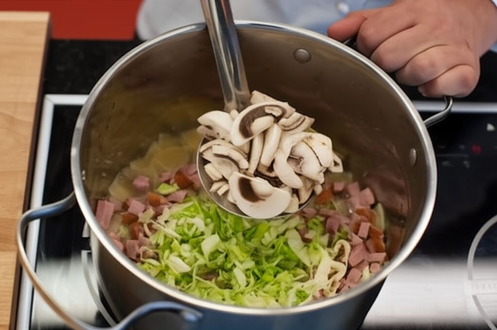 Dorzuć kapustę, pieczarki i kiełbasę. Wszystko duś przez około 10 minut.