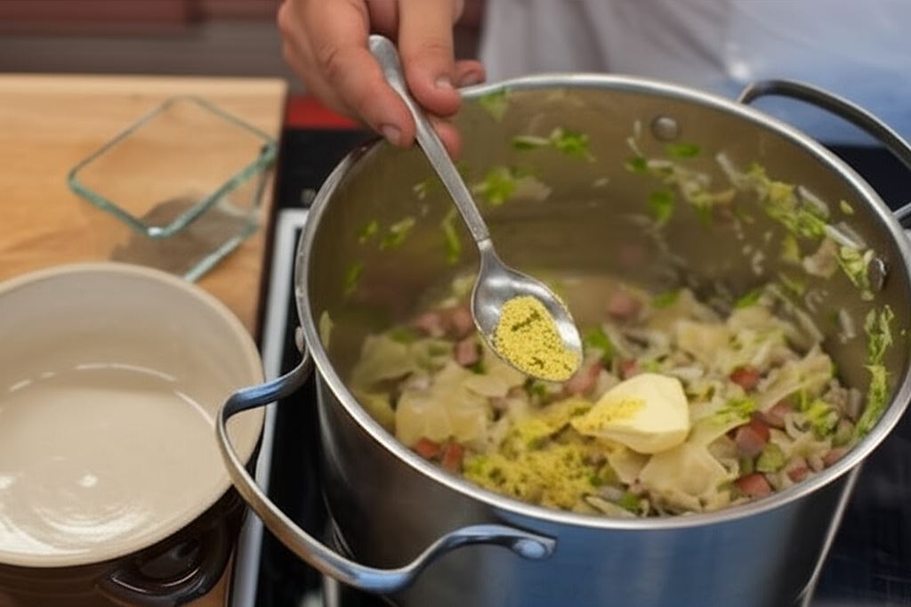 Na zakończenie wrzuć margarynę i przypraw przyprawą Knorr. Duś przez kilka minut więcej, by danie uzyskało lekko kremową konsystencję. Dopraw szczyptą pieprzu. Aby wzmocnić smak, możesz dodać do łazanek grzyby suszone.