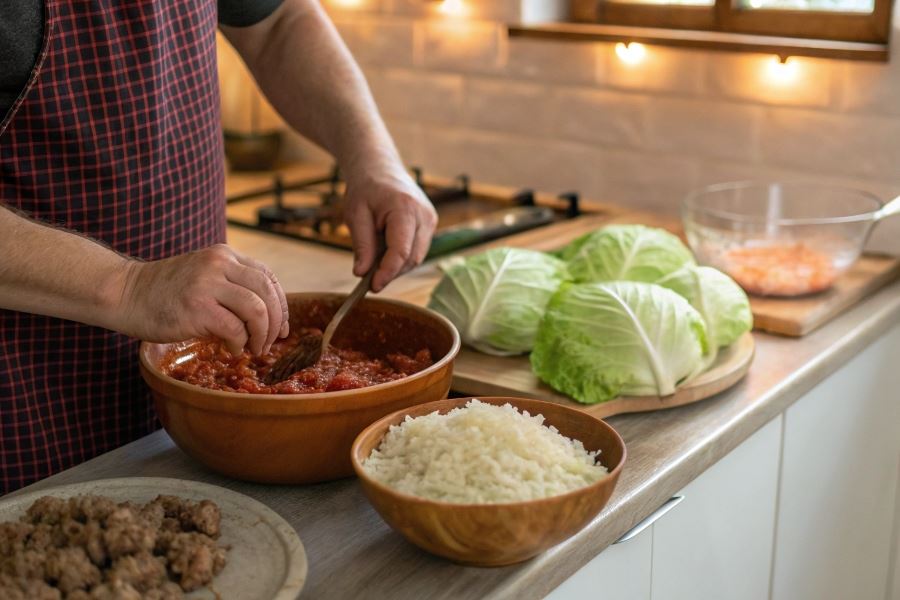 Przygotowanie farszu rozpoczyna się od ugotowania ryżu do półmiękka (około 10 minut) – powinien być lekko twardy, gdyż dogotuje się podczas pieczenia. Cebulę i czosnek należy drobno posiekać i zeszklić na oleju. Następnie dodajemy mięso mielone i smażymy do zrumienienia, doprawiając solą, pieprzem i pozostałymi przyprawami. Po ostygnięciu łączymy mięso z odcedzonym ryżem, dokładnie mieszając wszystkie składniki.