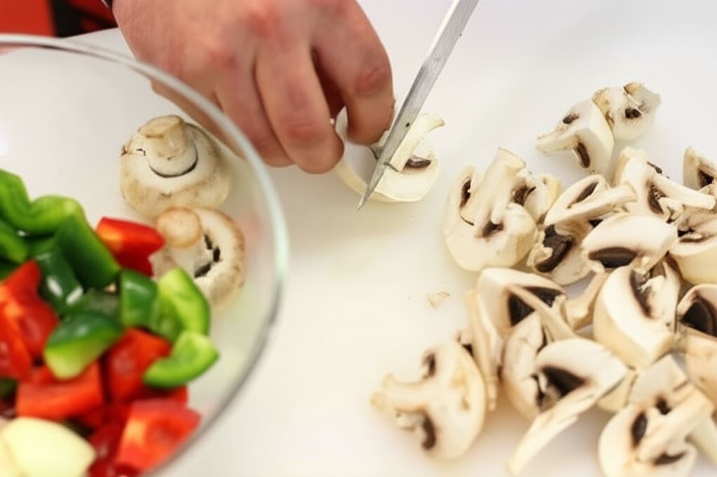 Papryki, cebulę i pomidory pokrój na duże kostki. Pieczarki na ćwiartki.
