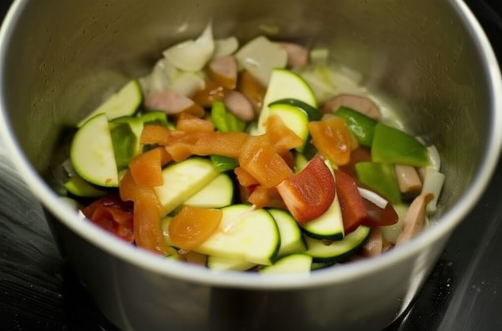 W szerokim garnku obsmaż na rozgrzanym smalcu kiełbasę, następnie dodaj cebulę, smaż moment. Potem wsyp pozostałe warzywa: cukinię, papryki i pomidory.