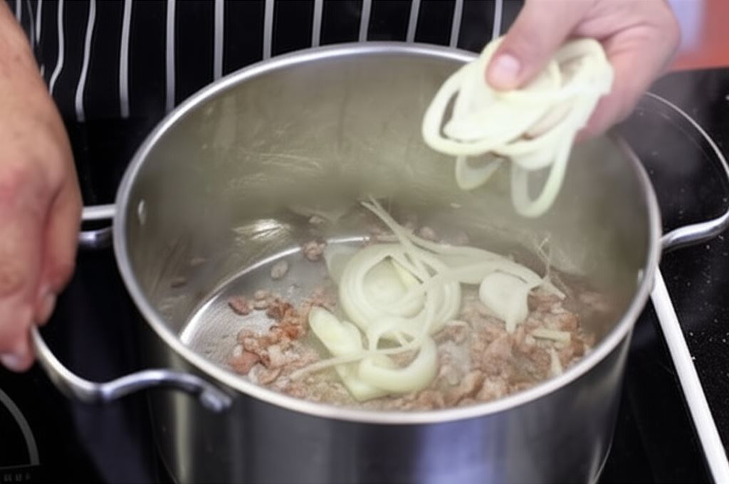 Cebulę pokrój na plastry, dodaj do boczku i duś do miękkości.