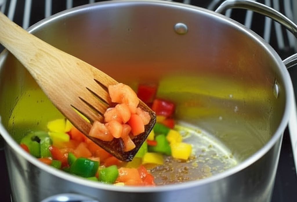 Papryki oczyść z nasion, pomidory zalej wrzątkiem i obierz ze skórki, po czym wszystko posiekaj w małą kostkę i wsyp do garnka.