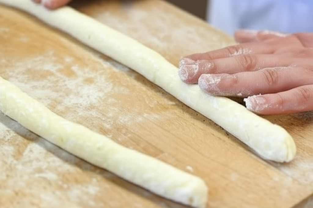 Twaróg, przepuszczony przez praskę, zmieszaj szybko i energicznie z jajkiem, skrobią ziemniaczaną oraz mąką pszenną i cukrem waniliowym formując zwarte ciasto. Odstaw na 10 minut. Potem oprósz lekko mąką, podziel ciasto na mniejsze porcje i z każdej uformuj wałeczek.