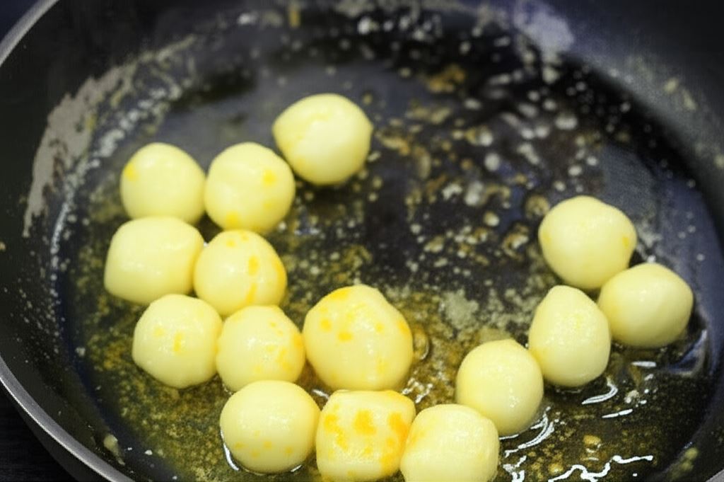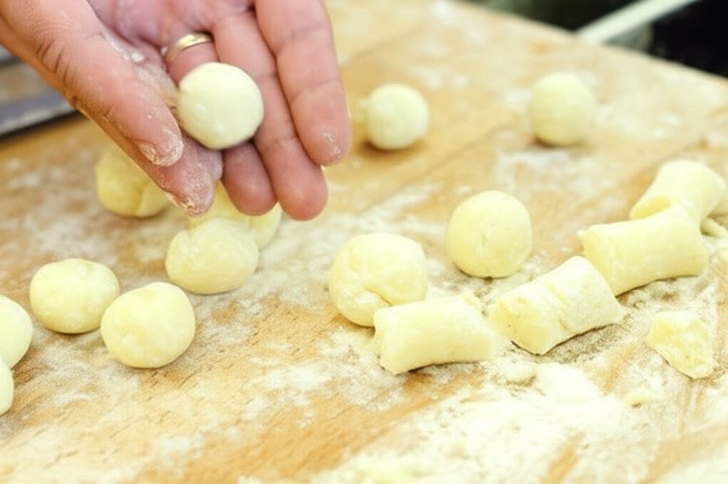 Paski ciasta potnij nożem na kwadraty. Potem dłońmi uformuj niewielkie kulki i gotuj w wodzie przez 2-3 minuty.