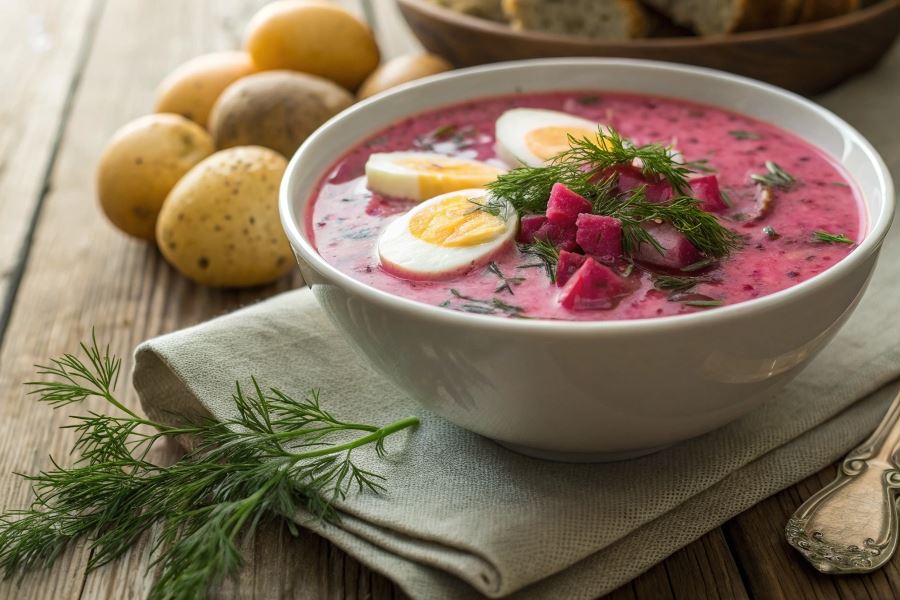 Tradycyjnie na Litwie zimny barszcz podaje się z gorącymi ziemniakami posypanymi koperkiem, co tworzy interesujący kontrast temperatur i smaków – zimna, kwaskowata zupa i gorące, delikatne ziemniaki stanowią idealne połączenie.