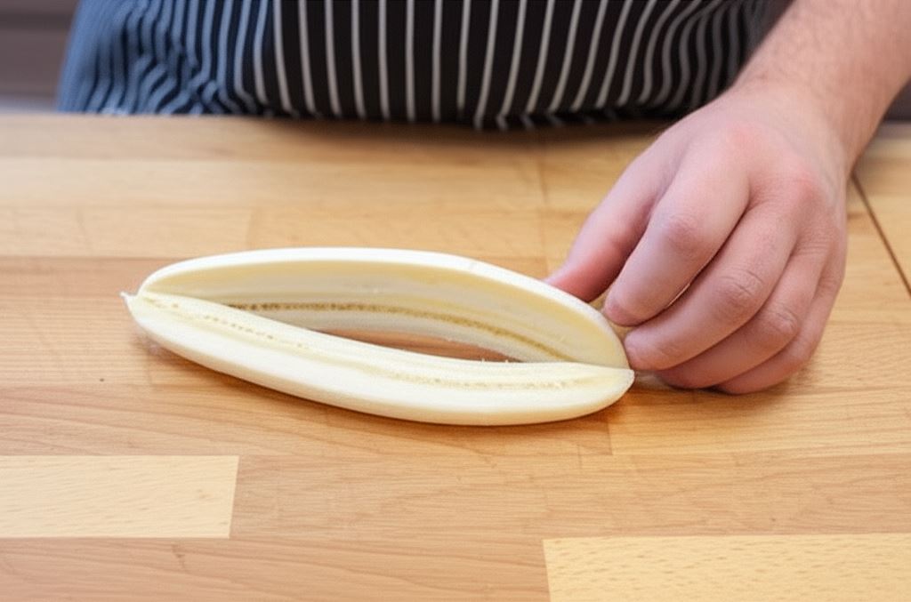 Owoce opłucz, banana obierz i przekrój wzdłuż na połowę.