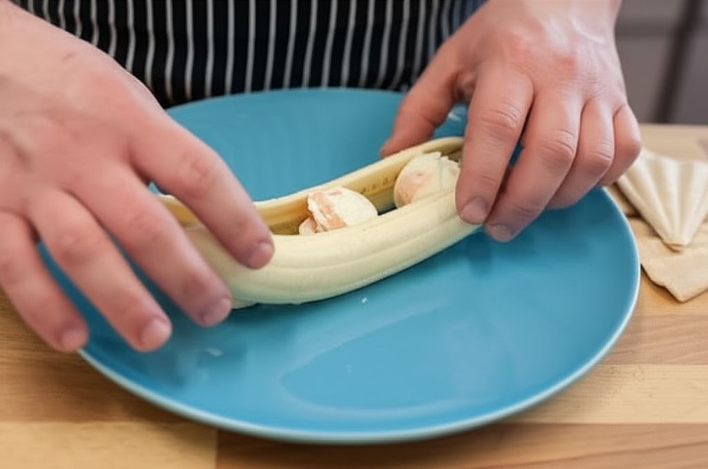 Porcje lodów umieść na talerzyku, po czym otocz bananem.