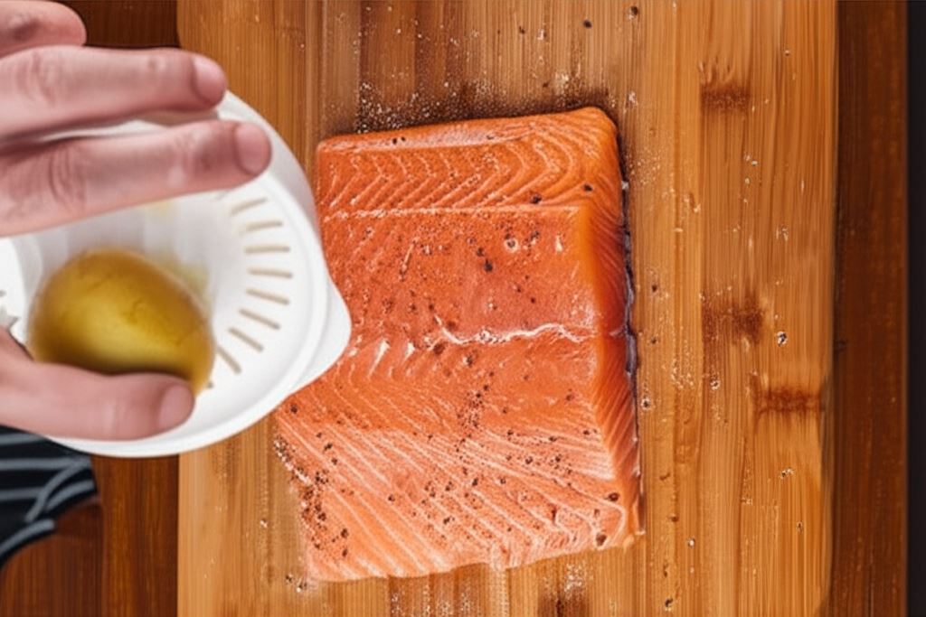 Łososiowy filet skrop cytrusowym sokiem, posól, posyp świeżo mielonym pieprzem i pozostaw na moment w chłodnym miejscu.