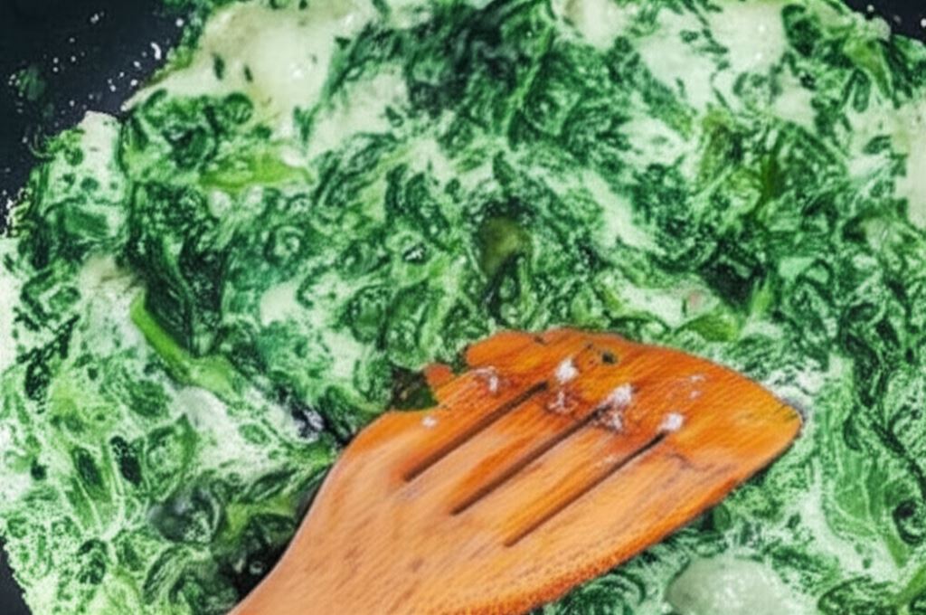 Szpinak podsmaż na maśle, wlej śmietanę, dodaj przyprawy, chwilę podgrzewaj. Gdy śmietana się zagotuje wsyp drobno posiekany czosnek.