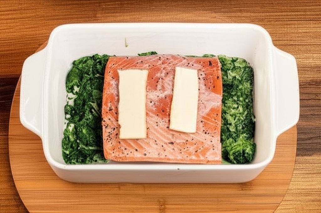 Naczynie żaroodporne posmaruj masłem, na dnie umieść szpinak, a na nim łososia. Rybę przykryj kawałkami masła.