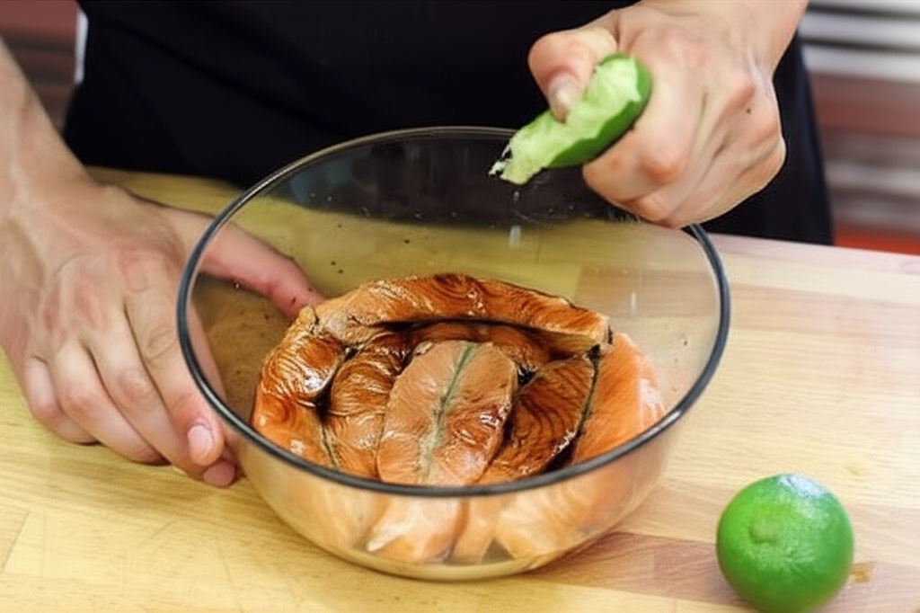 Łososia polej olejem, sosem sojowym i sokiem z limonki. Pozostaw na 15 minut żeby się zamarynował.