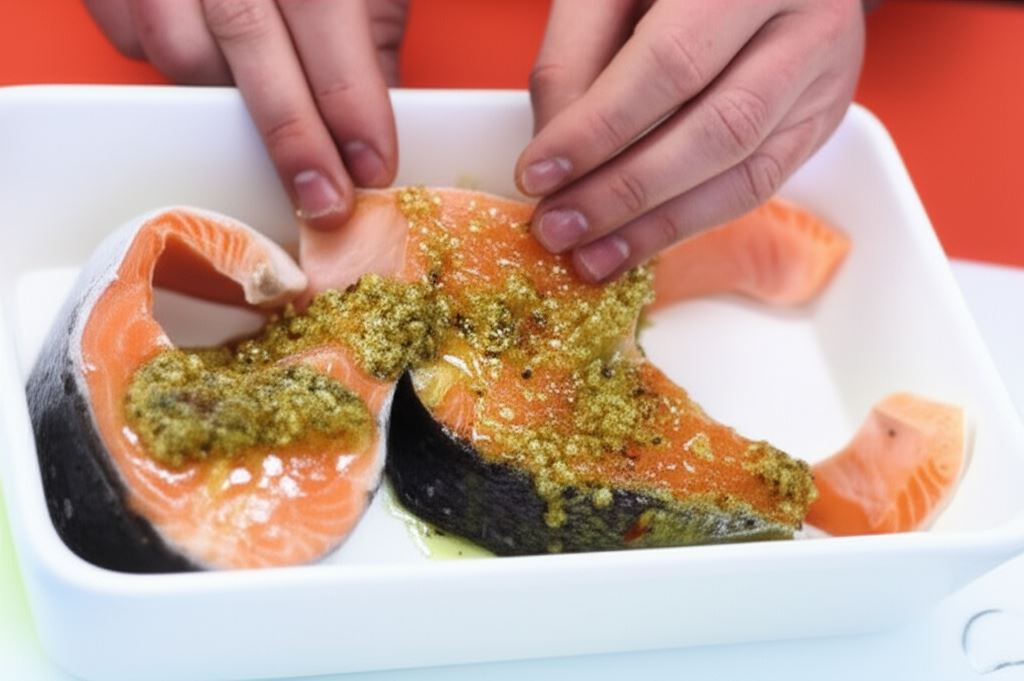 Przyprawę Knorr połącz z oliwą i sokiem z cytryny. Powstałą marynatą posmaruj dzwonki łososia.