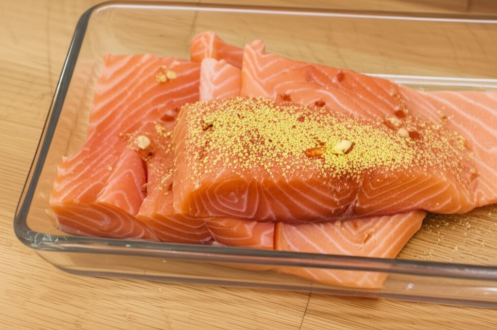 Filety łososiowe posyp Delikatem warzywnym po obu stronach, odłóż na bok w chłodne miejsce.