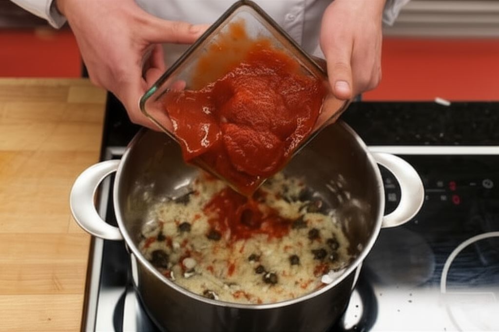 Na rozgrzanej oliwie w garnku o szerokim dnie zrumień drobno pokrojone chili i cebulę, wsyp pomidory z puszki, kapary oraz kostkę rosołową drobiową Knorr.