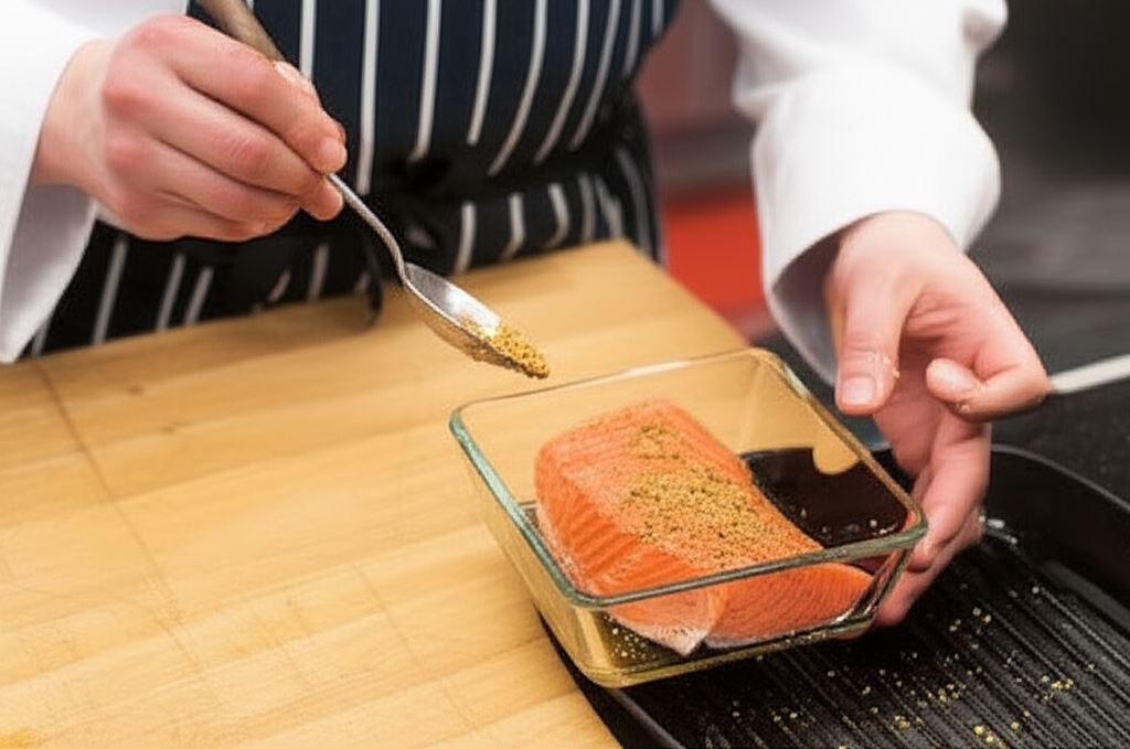 Zamarynowane porcje ryby smaż na papierze do pieczenia, na patelni grillowej około 4-5 minut z każdej strony. Serwuj z świeżą sałatą i plasterkiem cytryny.