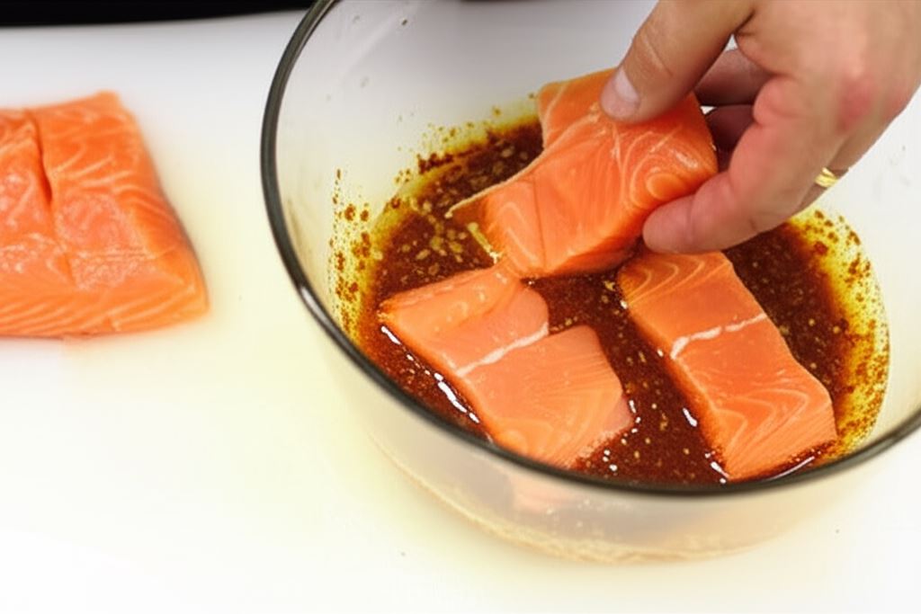 Łososia oczyść z ości i skóry, a następnie pokrój na steki o grubości około 2 cm. Potem umieść w przygotowanej marynacie.