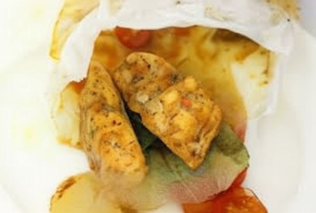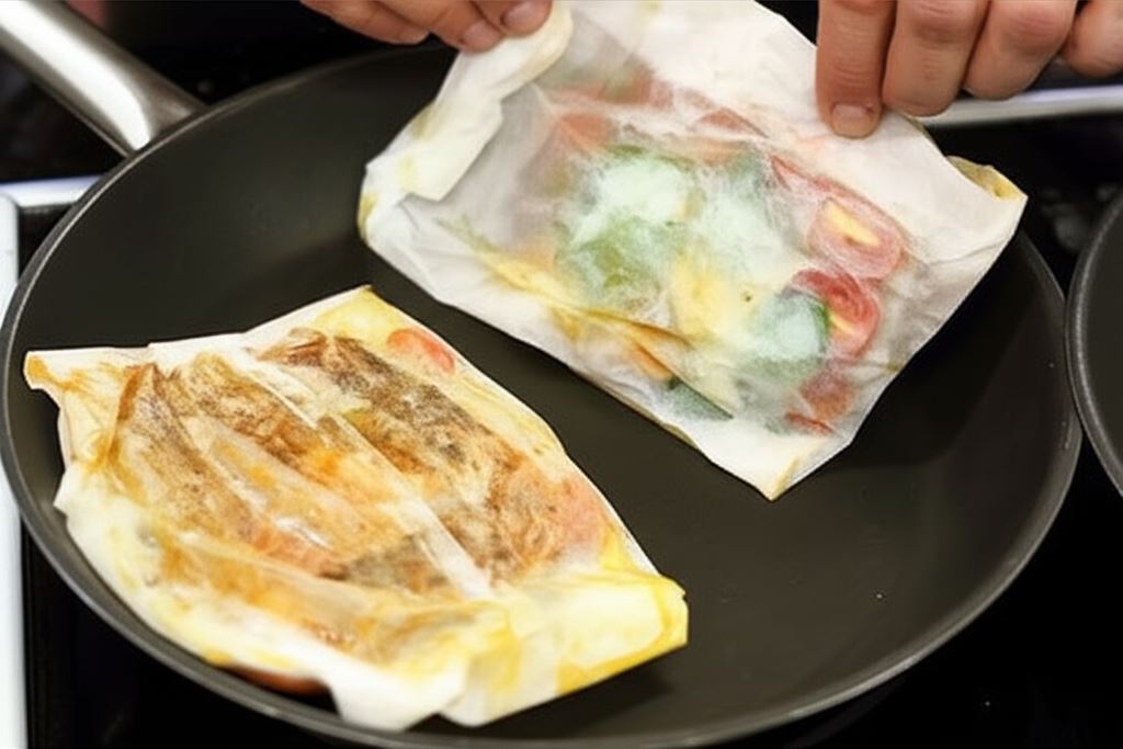 Po usmażeniu przenieś rybę i warzywa razem z wytworzonym sokiem z torebki na talerz, ostrożnie oddzielając rybę od soku i warzyw.