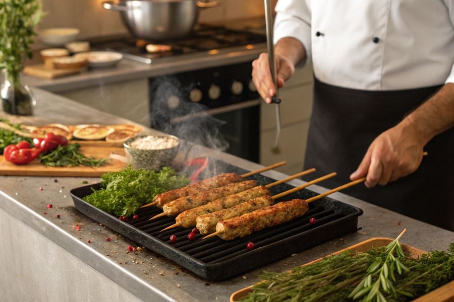 Formowanie lula kebaba wymaga techniki, która zapewni stabilność mięsa na szpadkach podczas pieczenia: