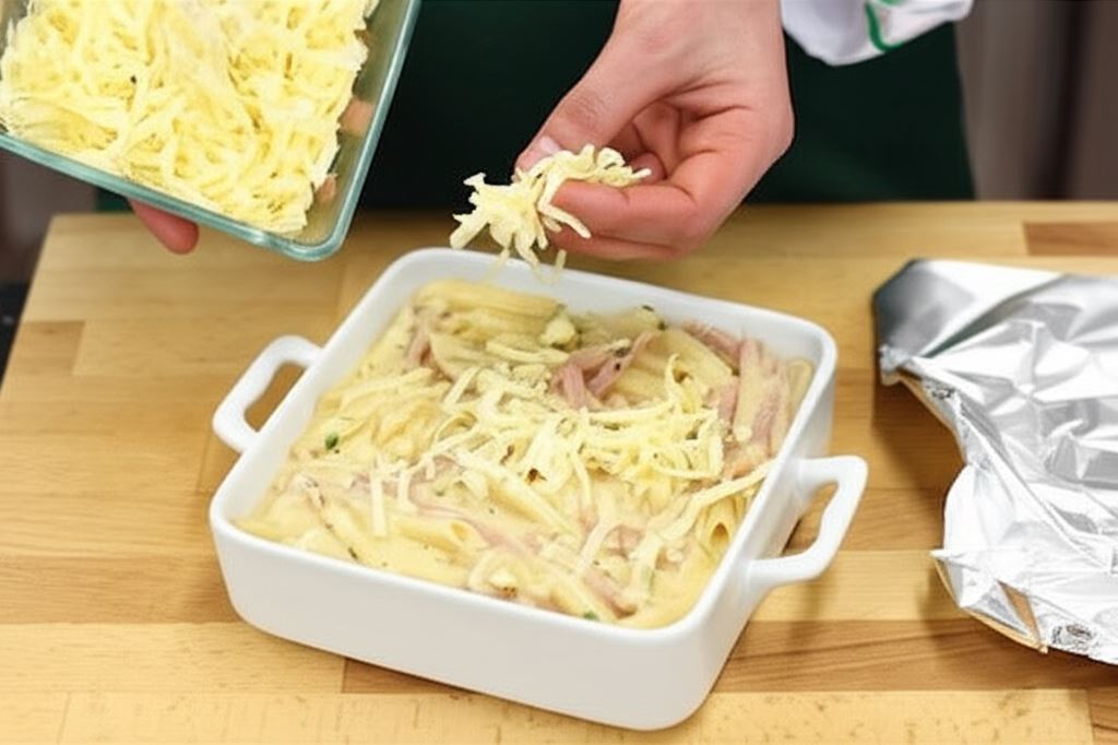 Nagrzej piekarnik do 200°C w opcji góra-dół. Weź odłożony ser i obsyp nim potrawę od góry. Przykryj naczynie folią aluminiową i umieść w nagrzanym piekarniku na 20 minut. Po tym czasie usuń folię i zapiekaj dodatkowo przez 5 minut. Ser na wierzchu powinien lekko się zrumienić.