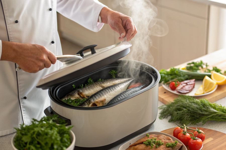 Multicooker utrzymuje optymalną temperaturę podczas całego procesu przygotowania, co ma kluczowe znaczenie dla zachowania cennych składników odżywczych makreli: